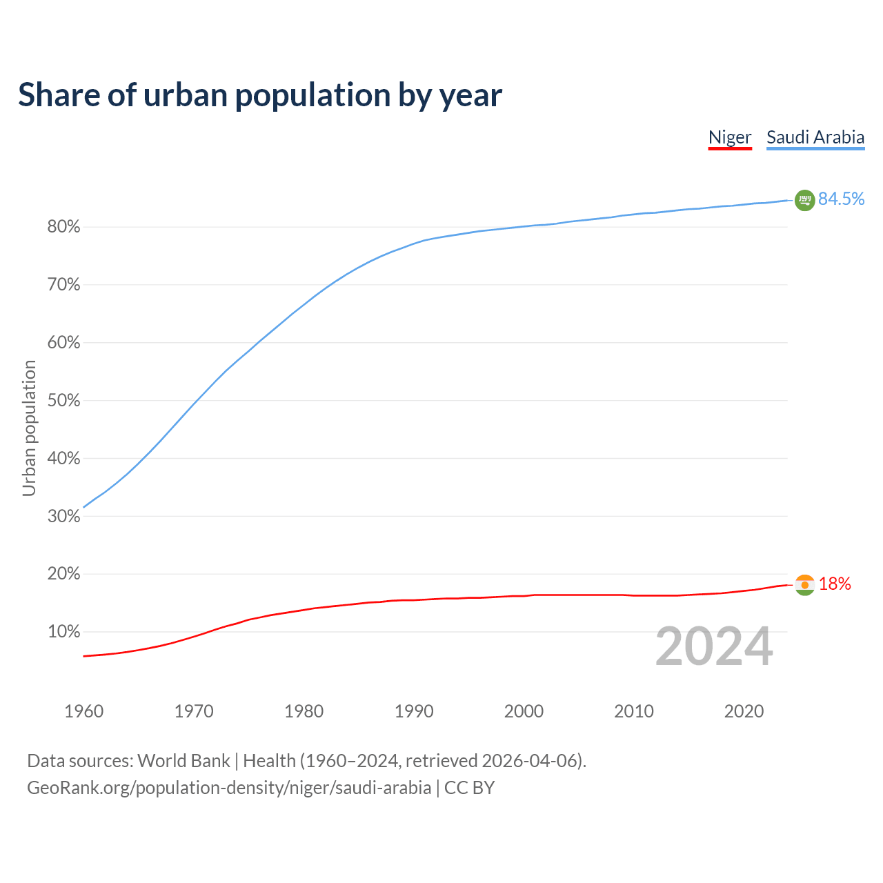 From 2004 to 2024, the share of urban population changed from 16.3% to 18% in Niger and from 80.8% to 84.5% in Saudi Arabia.