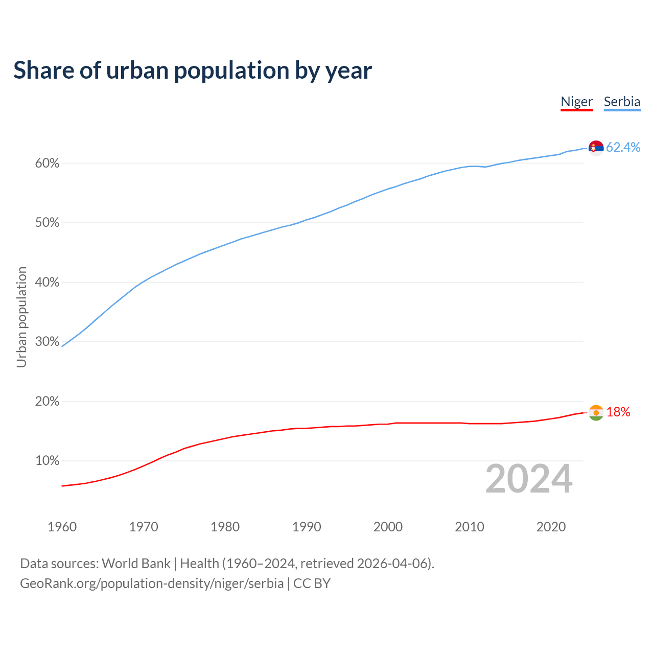 From 2004 to 2024, the share of urban population changed from 16.3% to 18% in Niger and from 57.3% to 62.4% in Serbia.