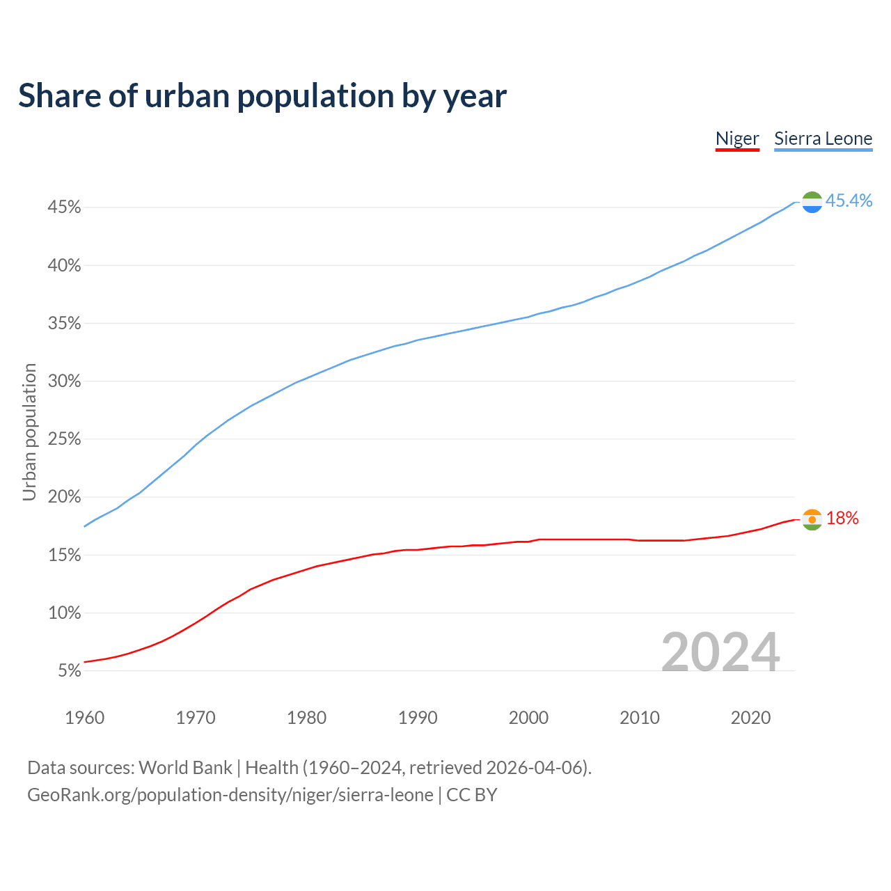 From 2004 to 2024, the share of urban population changed from 16.3% to 18% in Niger and from 36.5% to 45.4% in Sierra Leone.