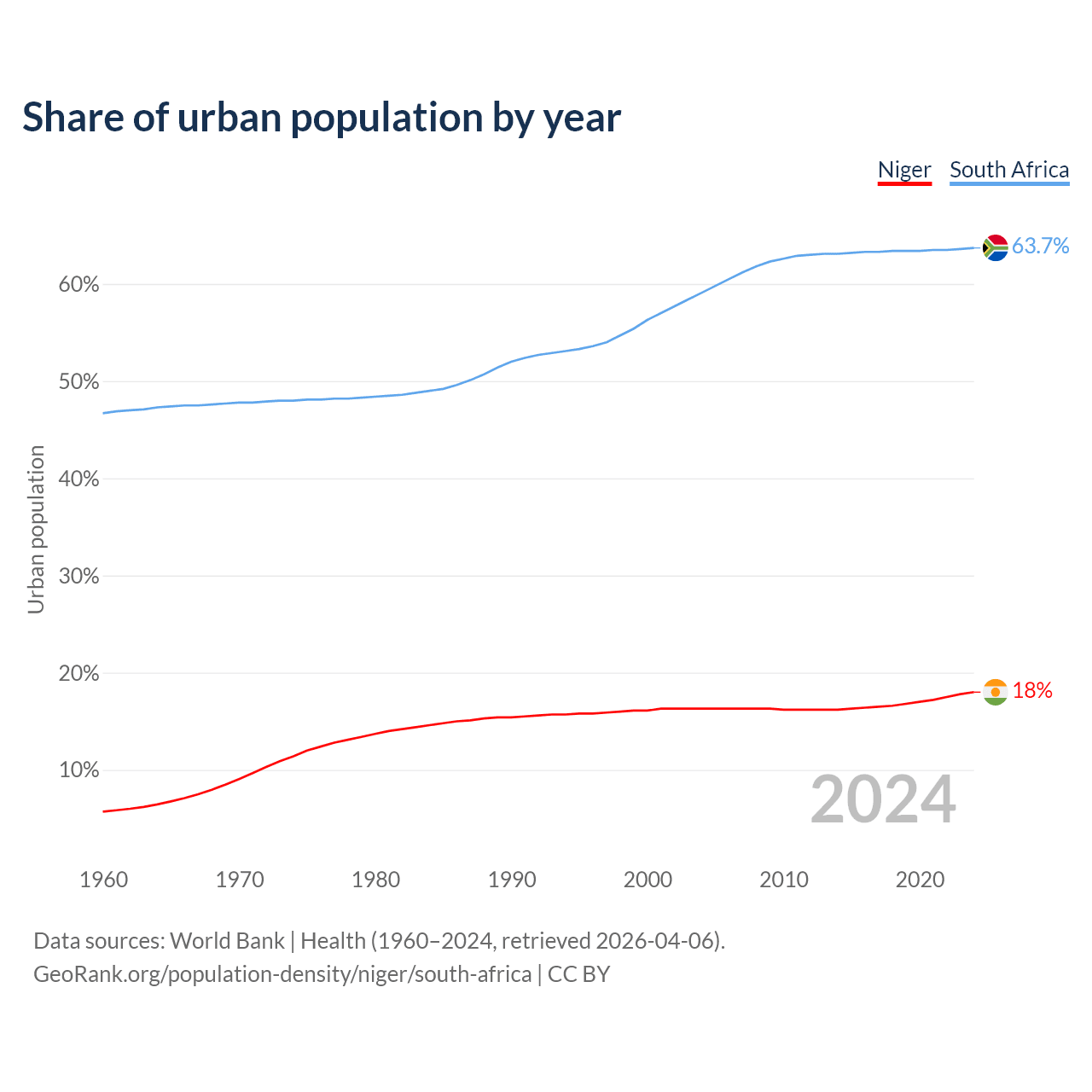 From 2004 to 2024, the share of urban population changed from 16.3% to 18% in Niger and from 59.1% to 63.7% in South Africa.