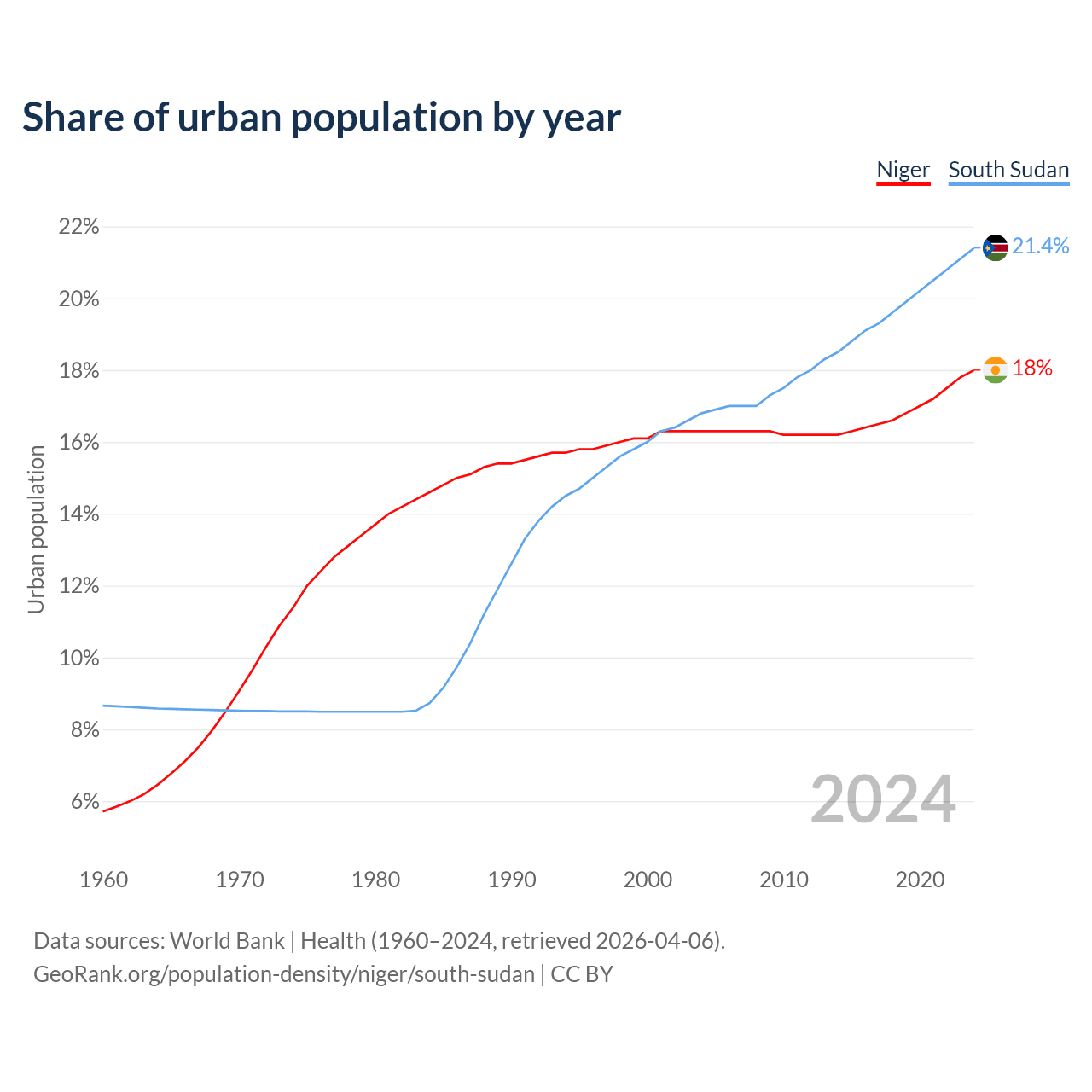 From 2004 to 2024, the share of urban population changed from 16.3% to 18% in Niger and from 16.8% to 21.4% in South Sudan.
