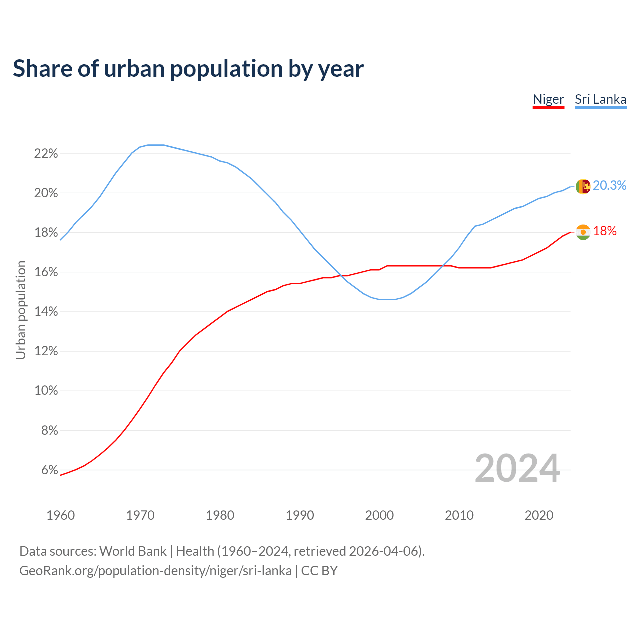 From 2004 to 2024, the share of urban population changed from 16.3% to 18% in Niger and from 14.9% to 20.3% in Sri Lanka.