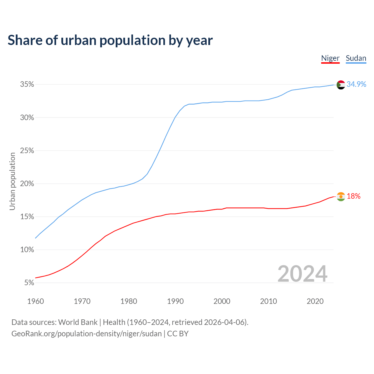 From 2004 to 2024, the share of urban population changed from 16.3% to 18% in Niger and from 32.4% to 34.9% in Sudan.
