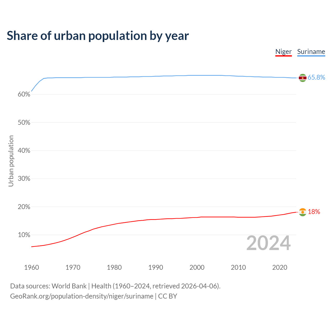 From 2004 to 2024, the share of urban population changed from 16.3% to 18% in Niger and from 66.7% to 65.8% in Suriname.