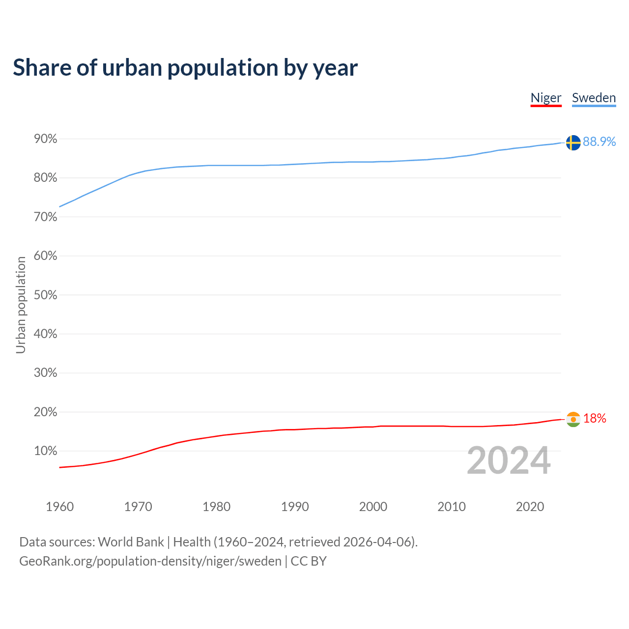 From 2004 to 2024, the share of urban population changed from 16.3% to 18% in Niger and from 84.3% to 88.9% in Sweden.
