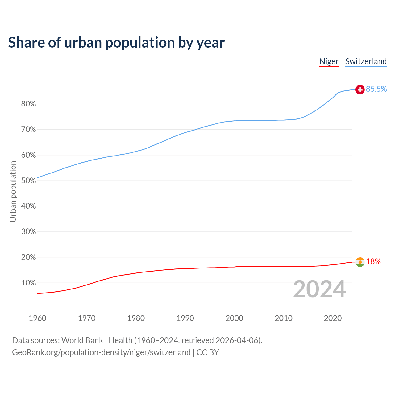 From 2004 to 2024, the share of urban population changed from 16.3% to 18% in Niger and from 73.5% to 85.5% in Switzerland.