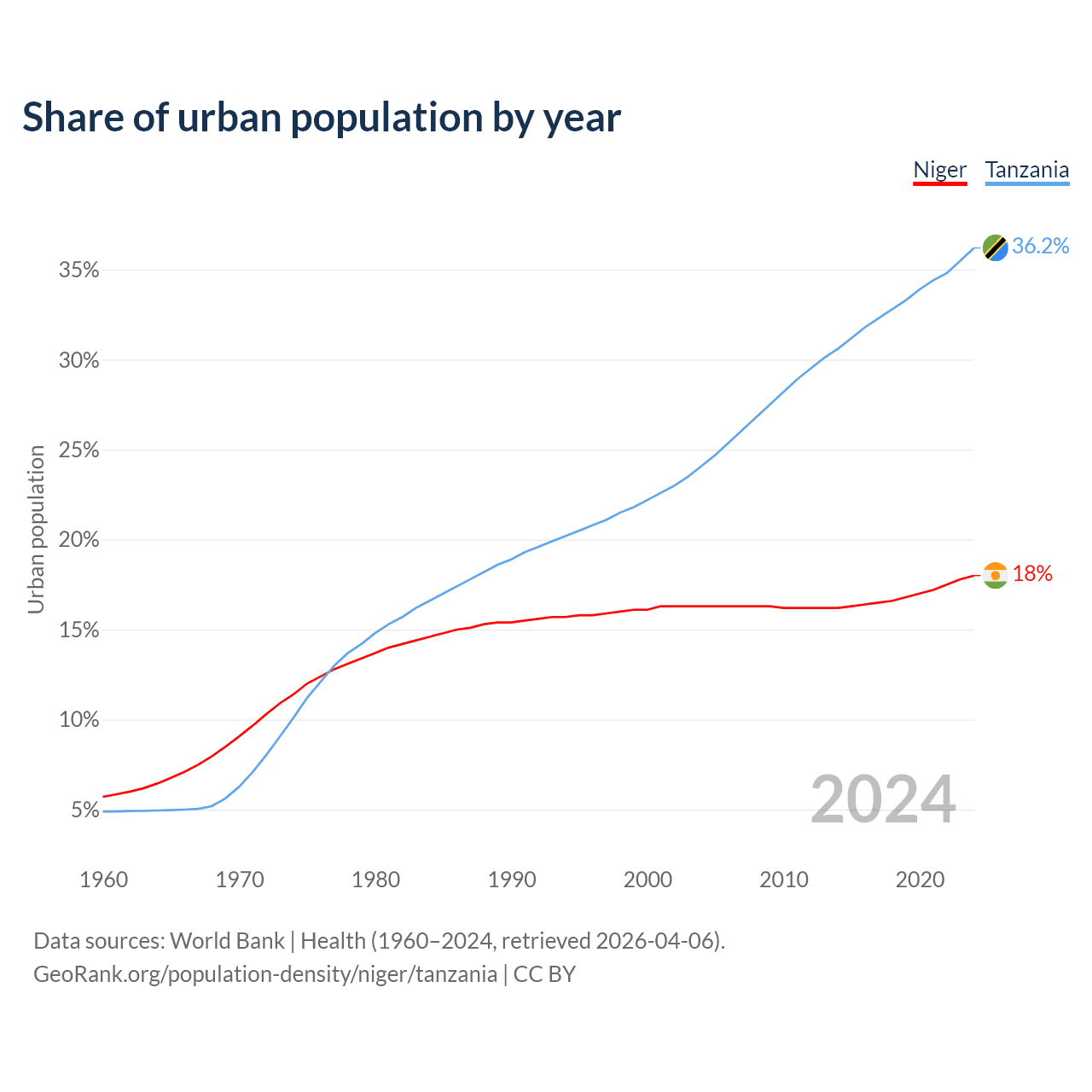 From 2004 to 2024, the share of urban population changed from 16.3% to 18% in Niger and from 24.1% to 36.2% in Tanzania.