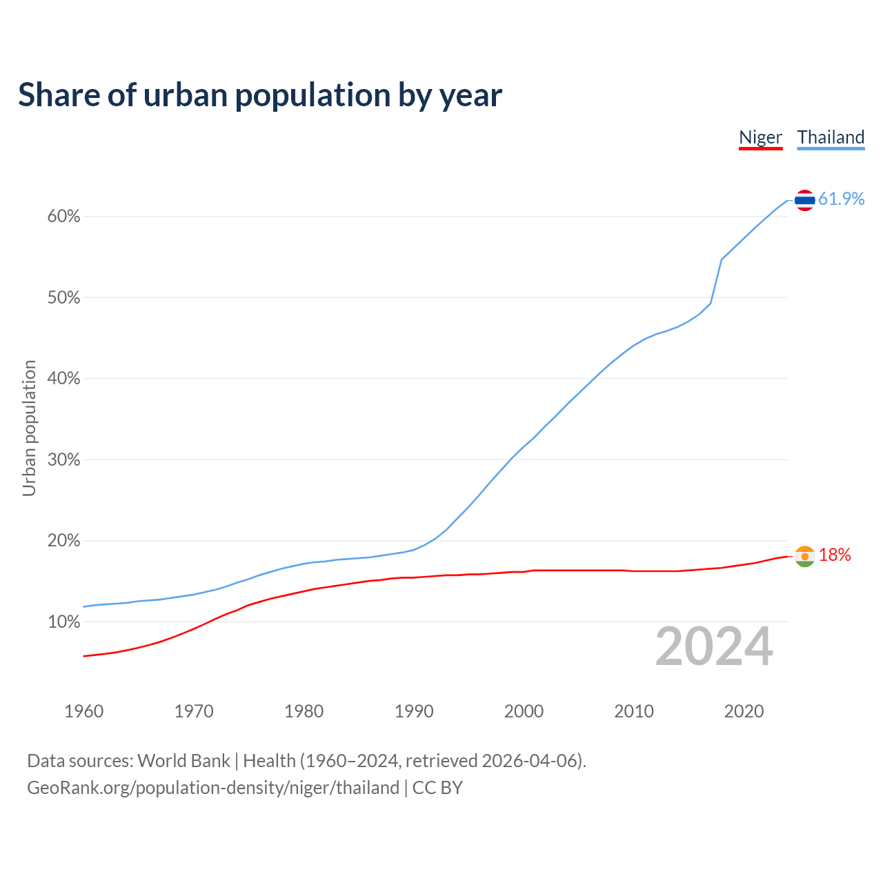 From 2004 to 2024, the share of urban population changed from 16.3% to 18% in Niger and from 36.8% to 61.9% in Thailand.