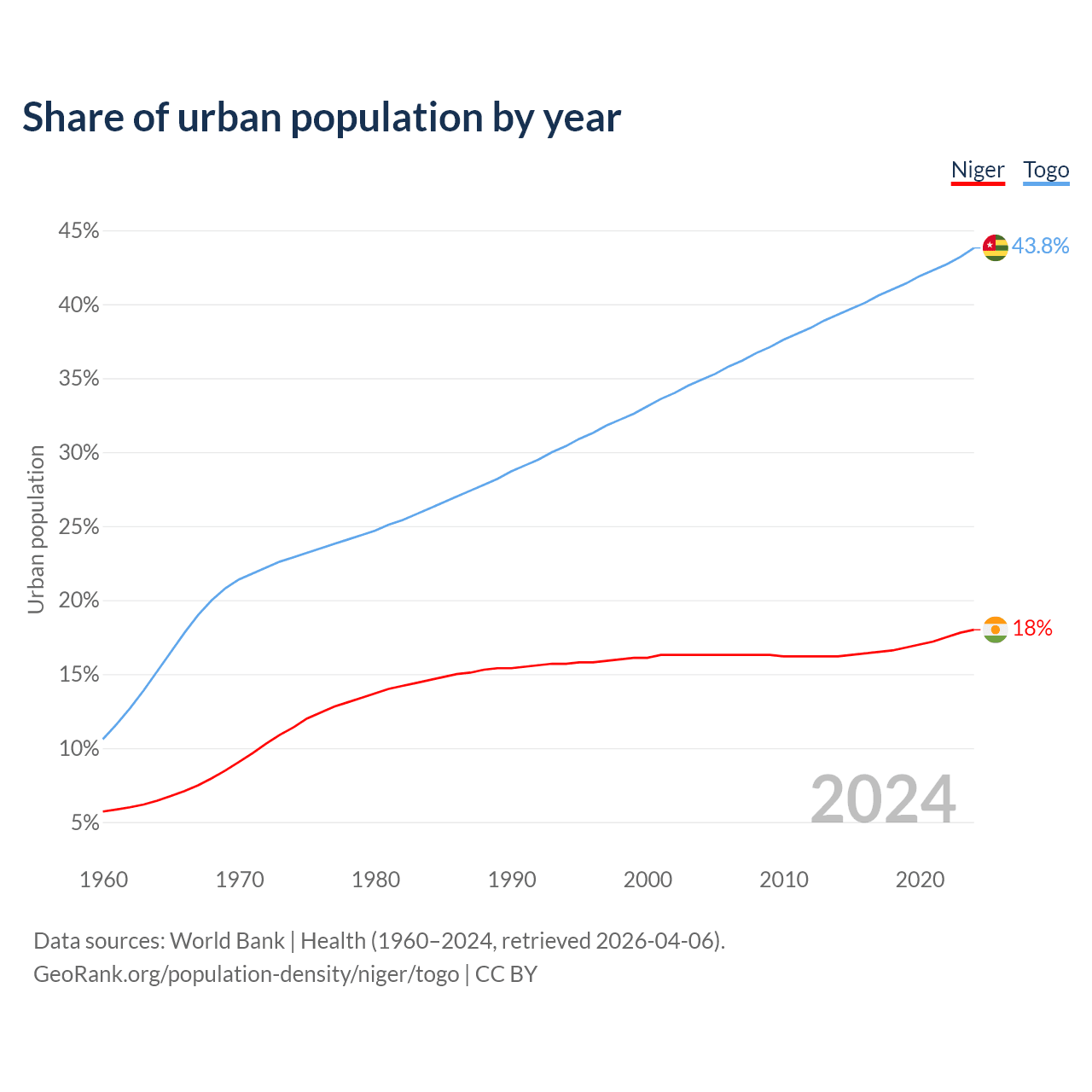 From 2004 to 2024, the share of urban population changed from 16.3% to 18% in Niger and from 34.9% to 43.8% in Togo.