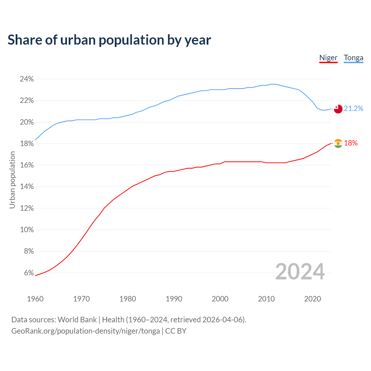 From 2004 to 2024, the share of urban population changed from 16.3% to 18% in Niger and from 23.1% to 21.2% in Tonga.