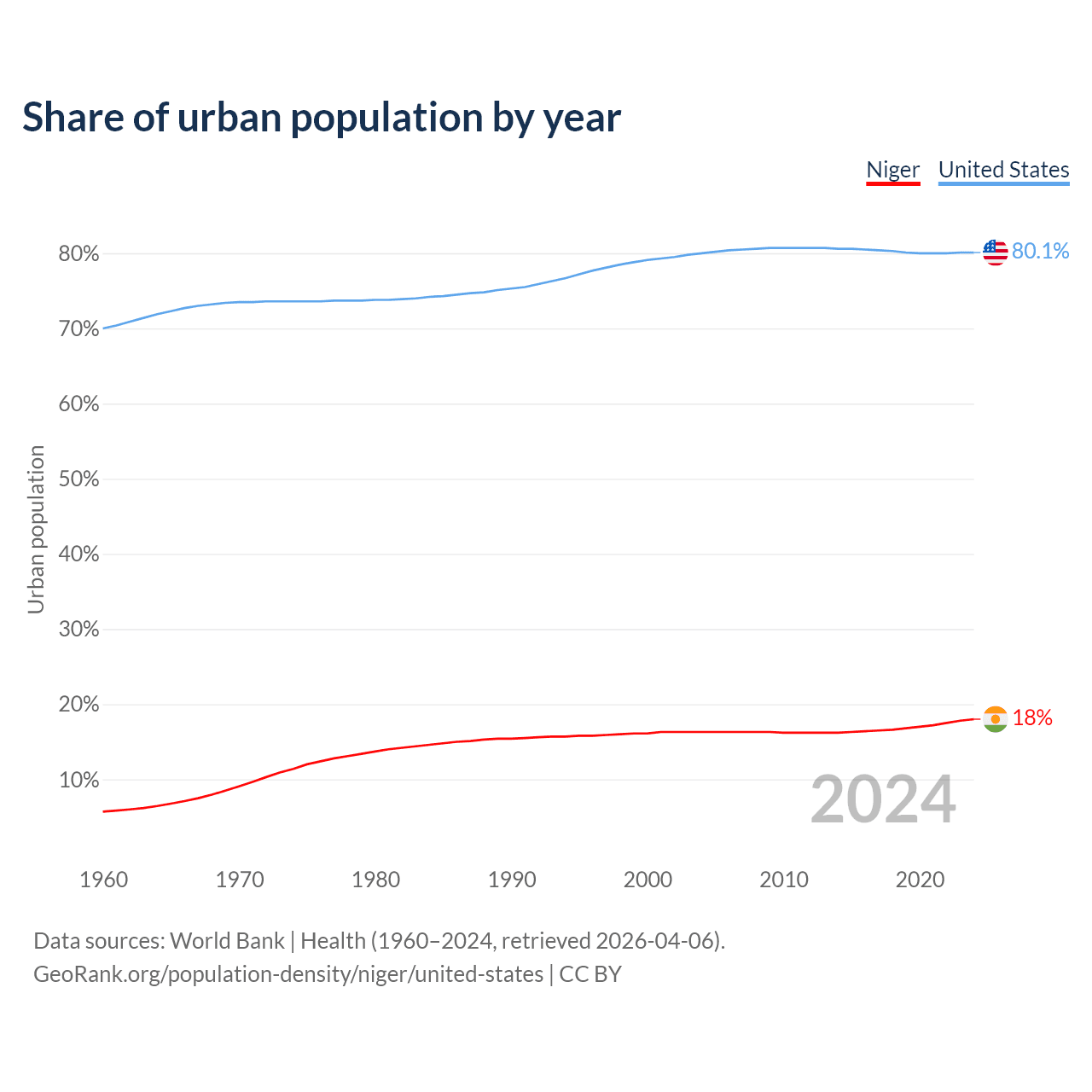 From 2004 to 2024, the share of urban population changed from 16.3% to 18% in Niger and from 80% to 80.1% in the United States.