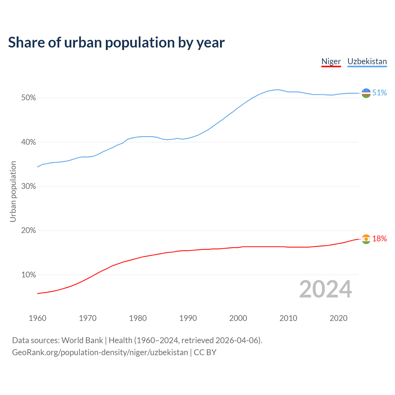 From 2004 to 2024, the share of urban population changed from 16.3% to 18% in Niger and from 50.6% to 51% in Uzbekistan.