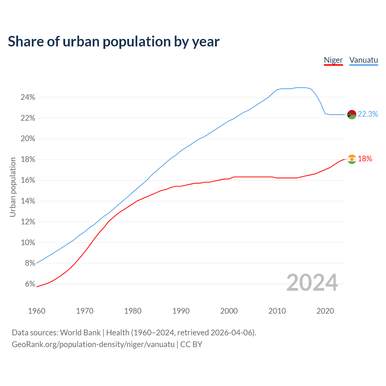 From 2004 to 2024, the share of urban population changed from 16.3% to 18% in Niger and from 22.7% to 22.3% in Vanuatu.