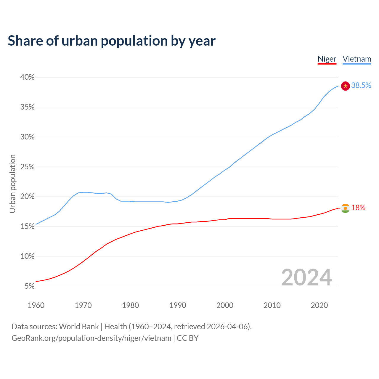 From 2004 to 2024, the share of urban population changed from 16.3% to 18% in Niger and from 26.8% to 38.5% in Vietnam.