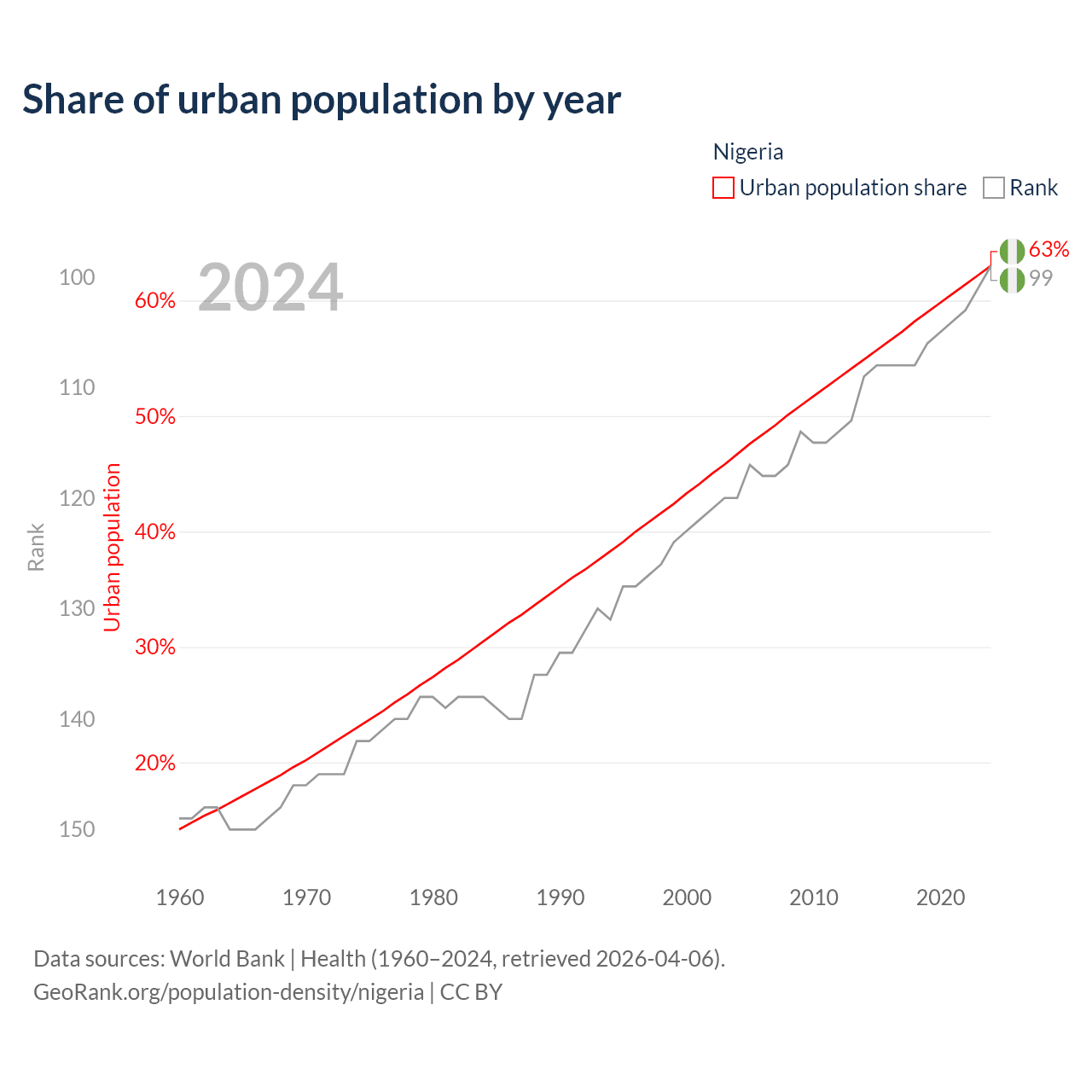 This chart shows the share of urban population in Nigeria from 1960 to 2024: 14.2% lived in urban areas in 1960, 43.3% in 2000, and 63% in 2024.
