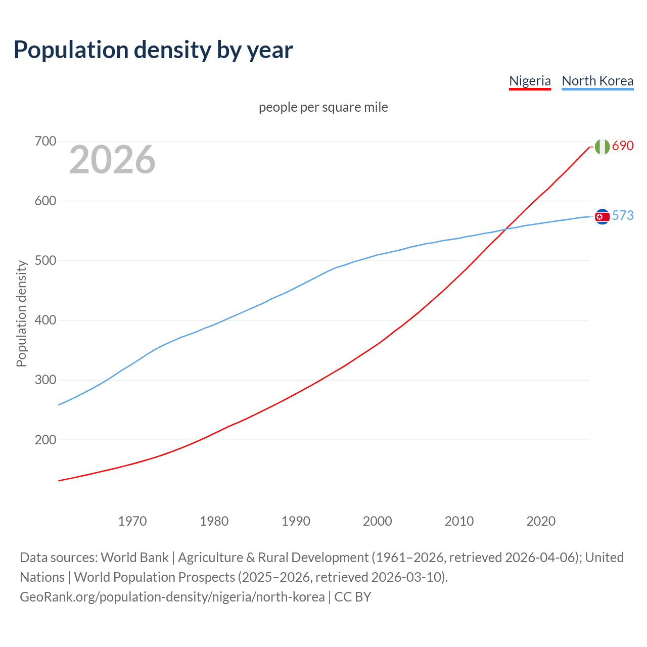 From 2006 to 2026, population density in Nigeria increased by 62.7%, compared to a 8.64% growth in North Korea.