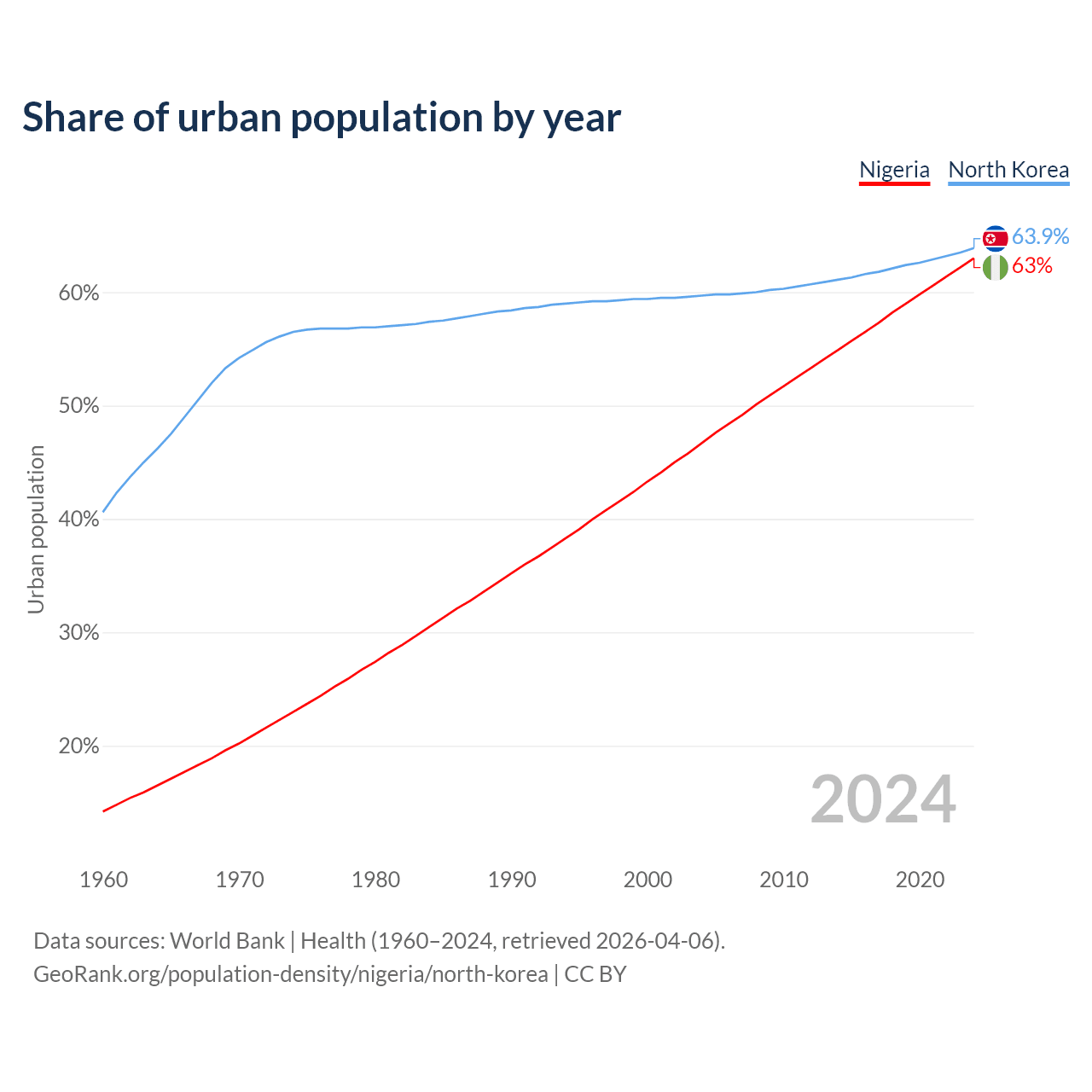 From 2004 to 2024, the share of urban population changed from 46.7% to 63% in Nigeria and from 59.7% to 63.9% in North Korea.