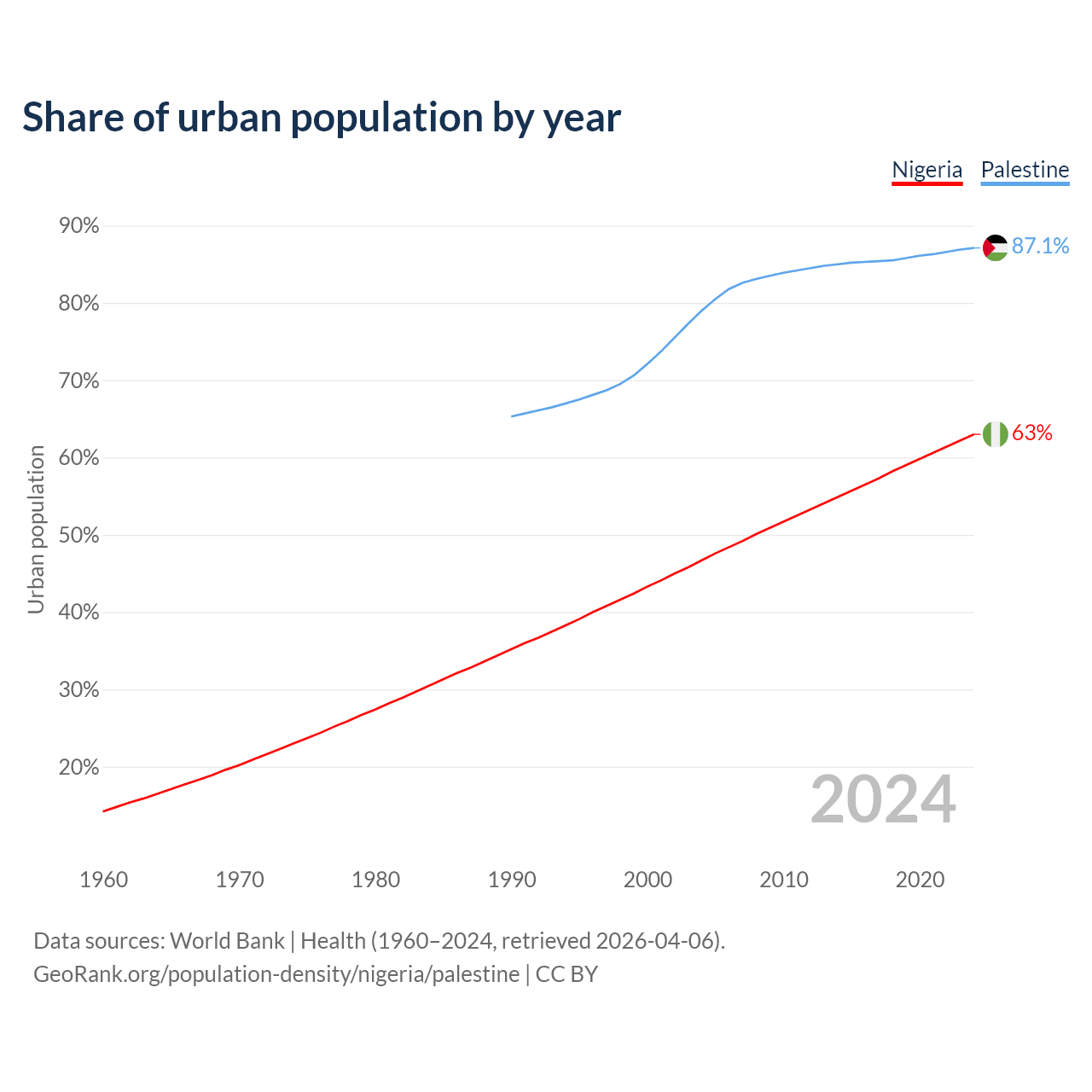 From 2004 to 2024, the share of urban population changed from 46.7% to 63% in Nigeria and from 79% to 87.1% in Palestine.