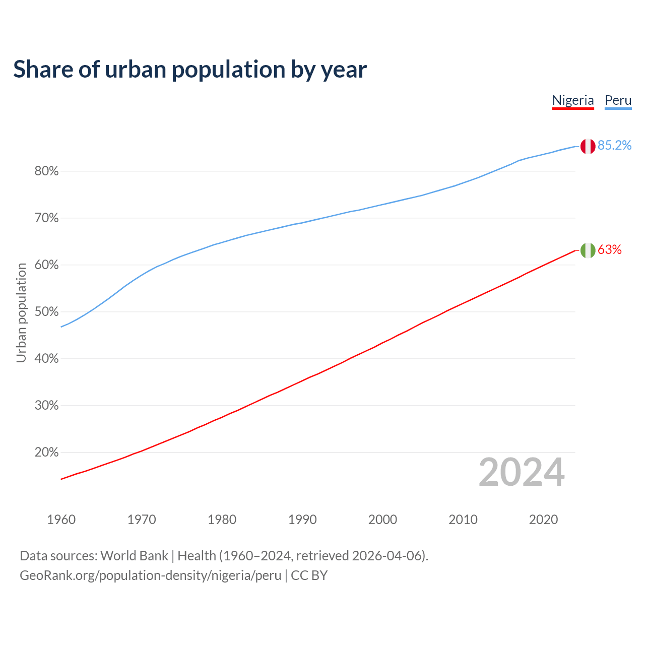 From 2004 to 2024, the share of urban population changed from 46.7% to 63% in Nigeria and from 74.4% to 85.2% in Peru.