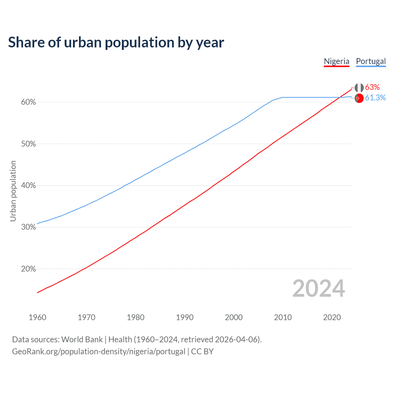 From 2004 to 2024, the share of urban population changed from 46.7% to 63% in Nigeria and from 57.4% to 61.3% in Portugal.