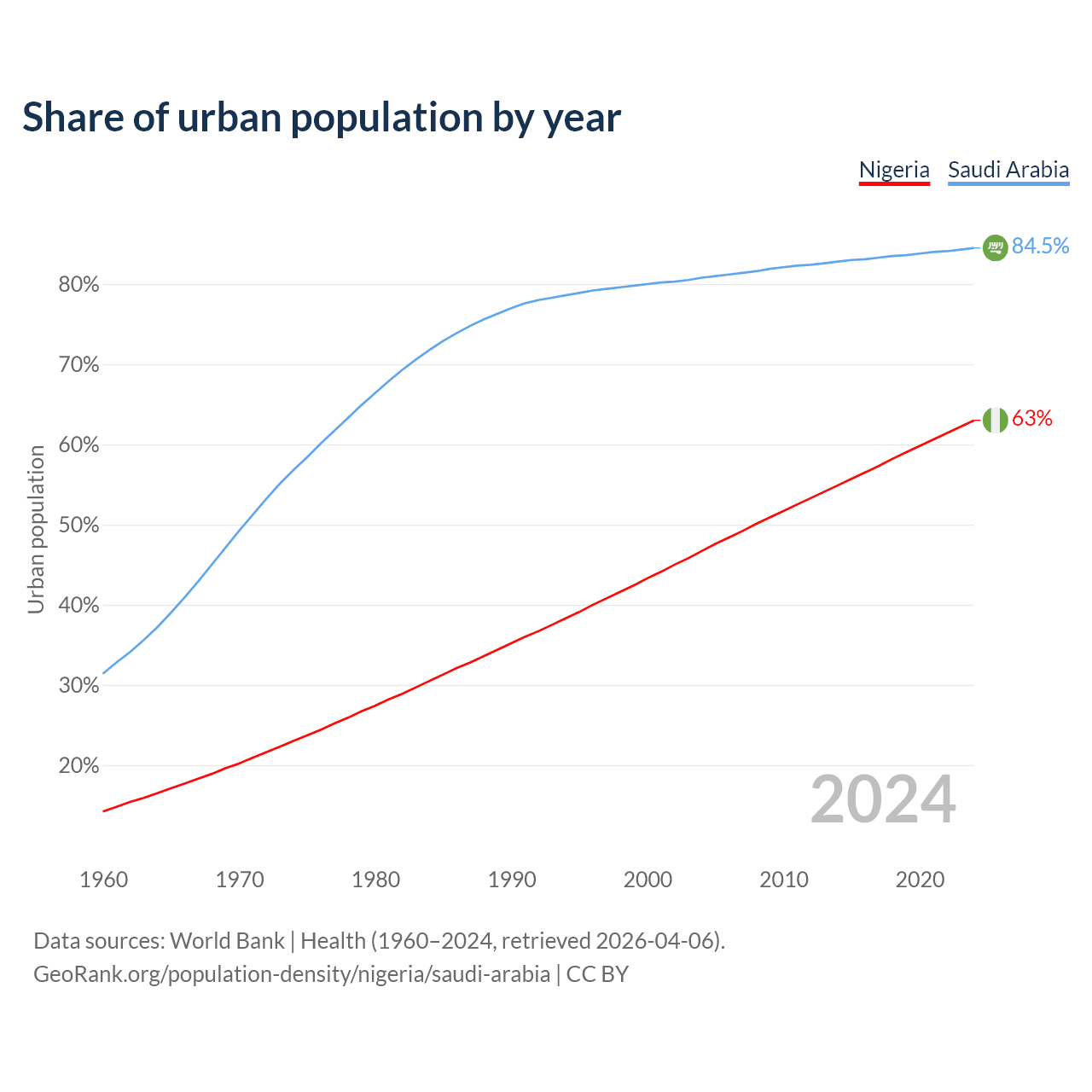 From 2004 to 2024, the share of urban population changed from 46.7% to 63% in Nigeria and from 80.8% to 84.5% in Saudi Arabia.