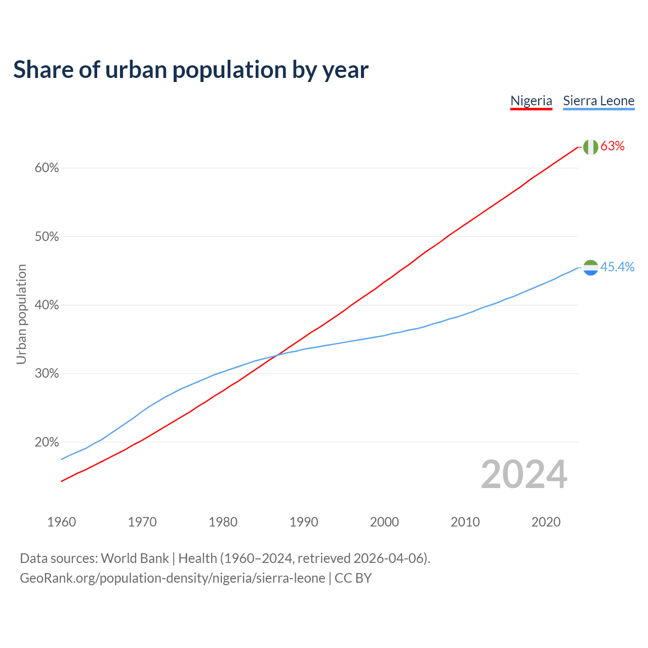 From 2004 to 2024, the share of urban population changed from 46.7% to 63% in Nigeria and from 36.5% to 45.4% in Sierra Leone.