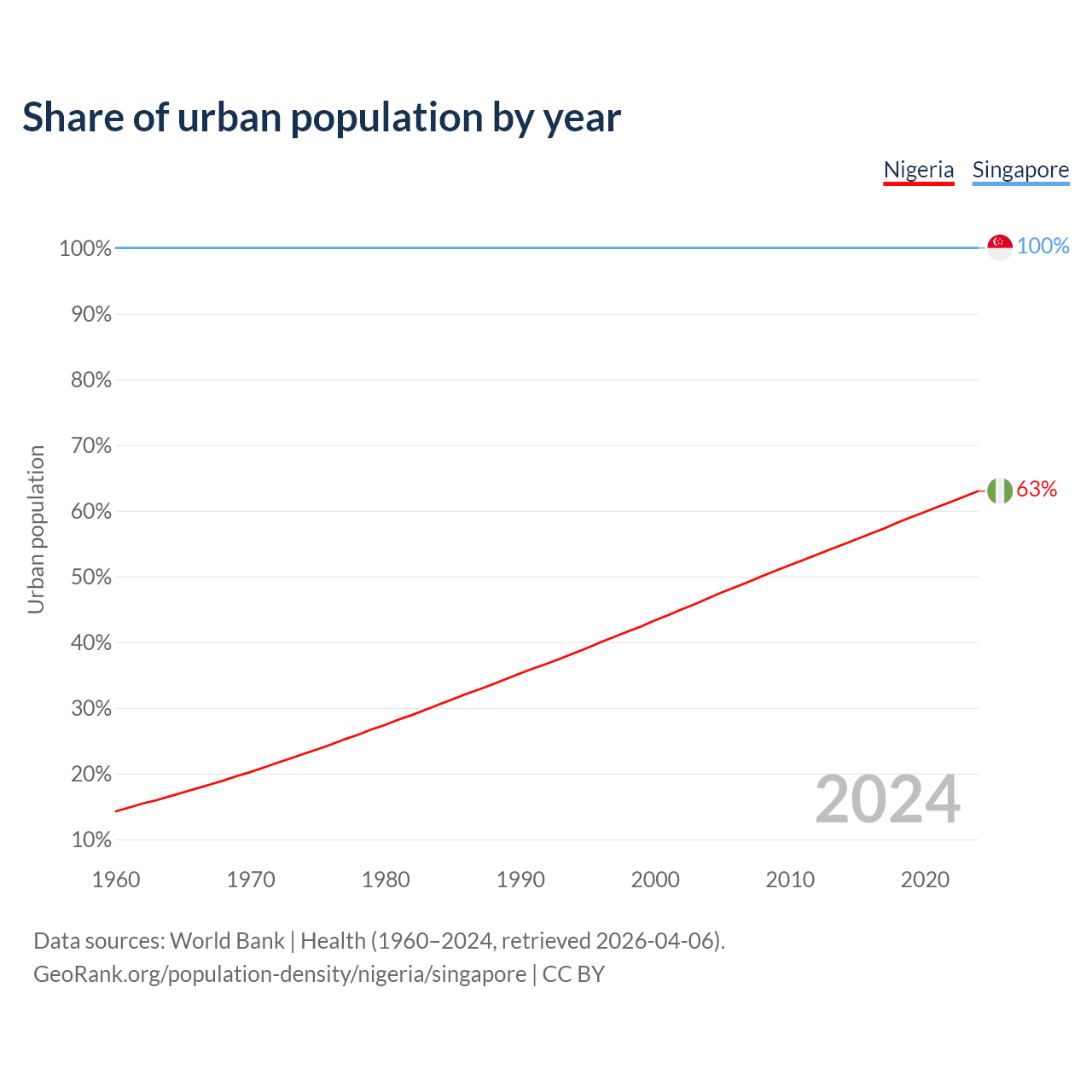 From 2004 to 2024, the share of urban population changed from 46.7% to 63% in Nigeria and from 100% to 100% in Singapore.