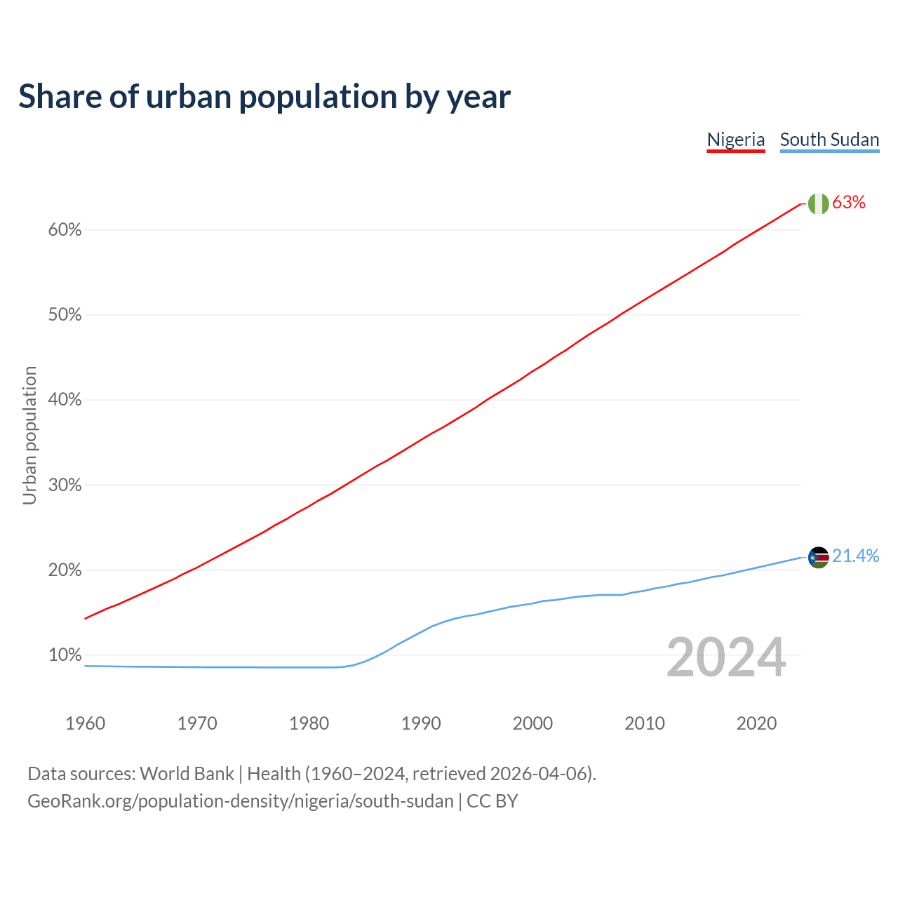 From 2004 to 2024, the share of urban population changed from 46.7% to 63% in Nigeria and from 16.8% to 21.4% in South Sudan.