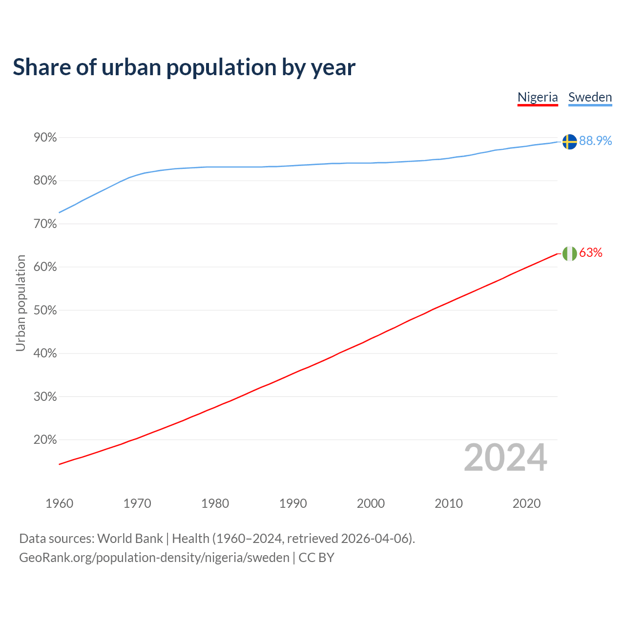 From 2004 to 2024, the share of urban population changed from 46.7% to 63% in Nigeria and from 84.3% to 88.9% in Sweden.