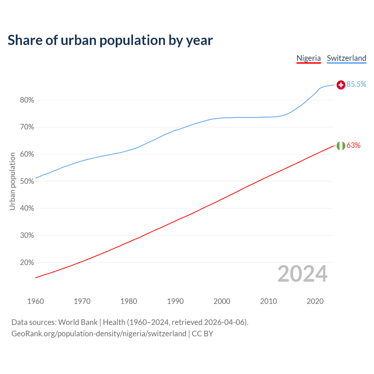 From 2004 to 2024, the share of urban population changed from 46.7% to 63% in Nigeria and from 73.5% to 85.5% in Switzerland.