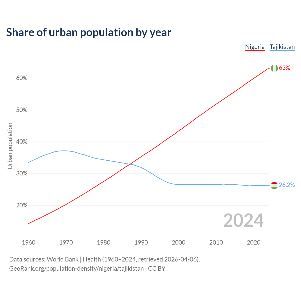 From 2004 to 2024, the share of urban population changed from 46.7% to 63% in Nigeria and from 26.5% to 26.2% in Tajikistan.