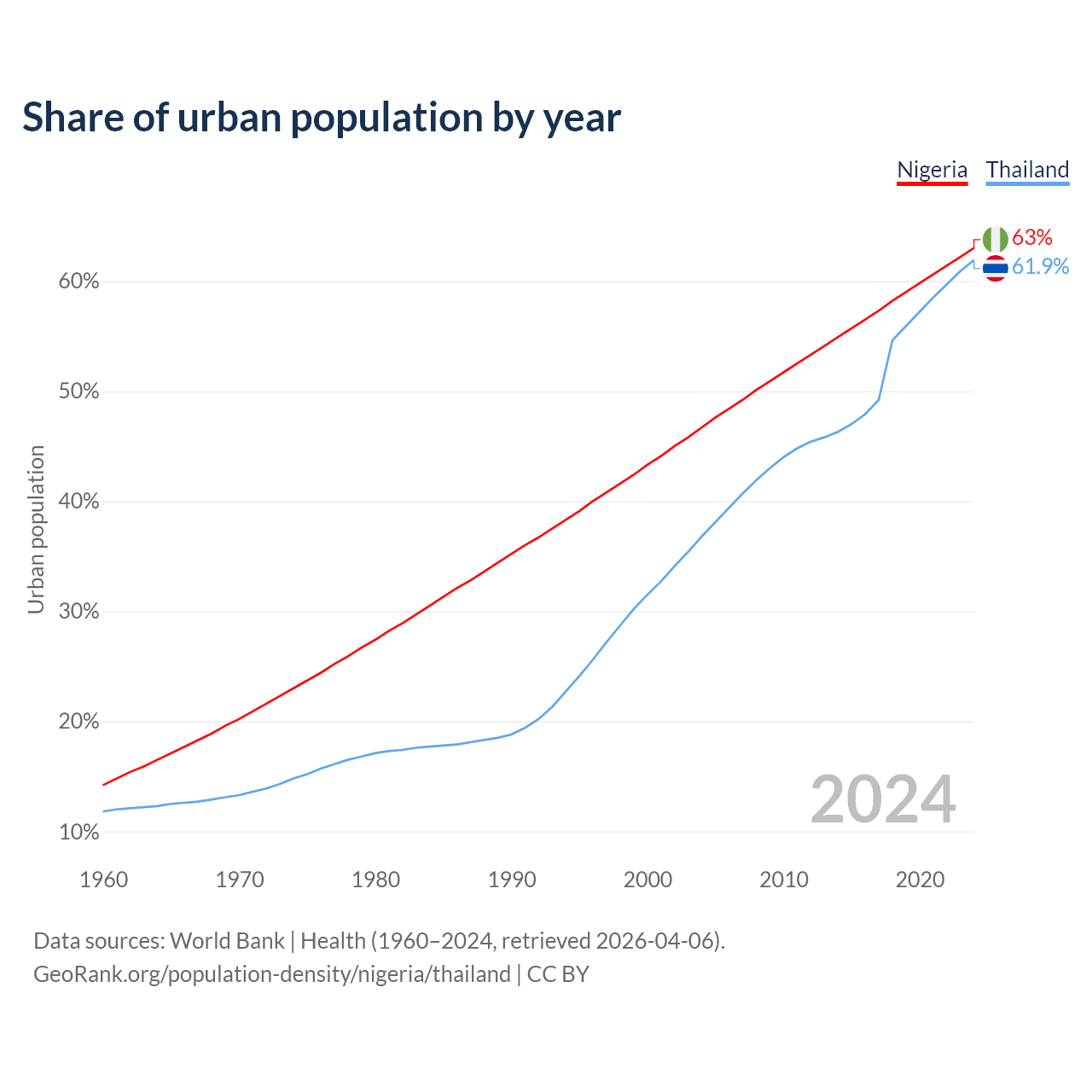 From 2004 to 2024, the share of urban population changed from 46.7% to 63% in Nigeria and from 36.8% to 61.9% in Thailand.