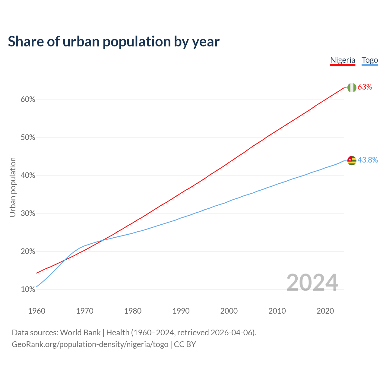 From 2004 to 2024, the share of urban population changed from 46.7% to 63% in Nigeria and from 34.9% to 43.8% in Togo.