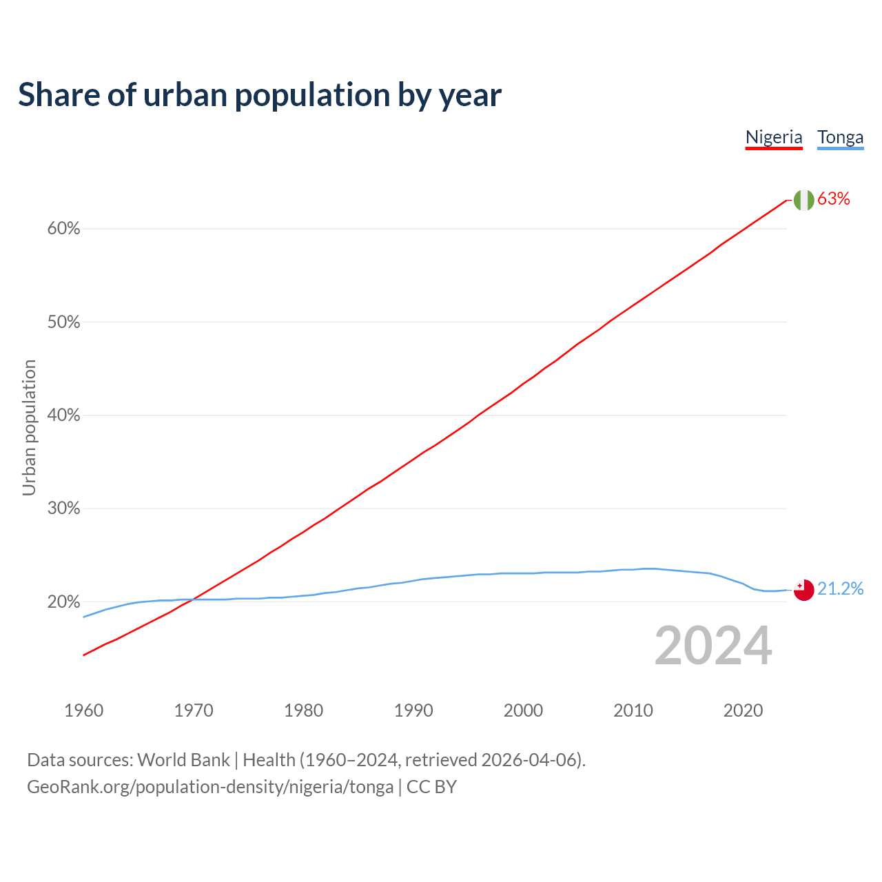 From 2004 to 2024, the share of urban population changed from 46.7% to 63% in Nigeria and from 23.1% to 21.2% in Tonga.