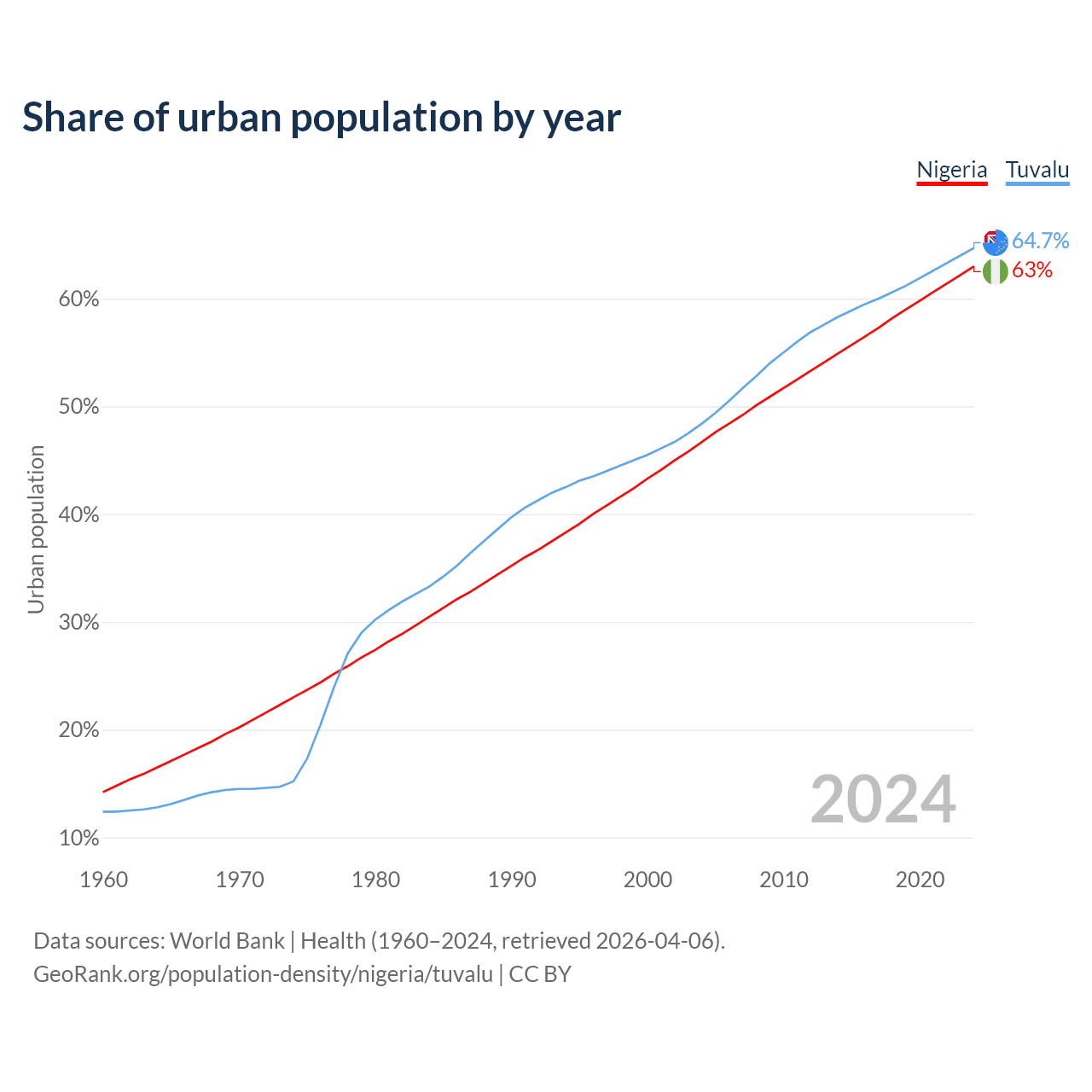 From 2004 to 2024, the share of urban population changed from 46.7% to 63% in Nigeria and from 48.4% to 64.7% in Tuvalu.