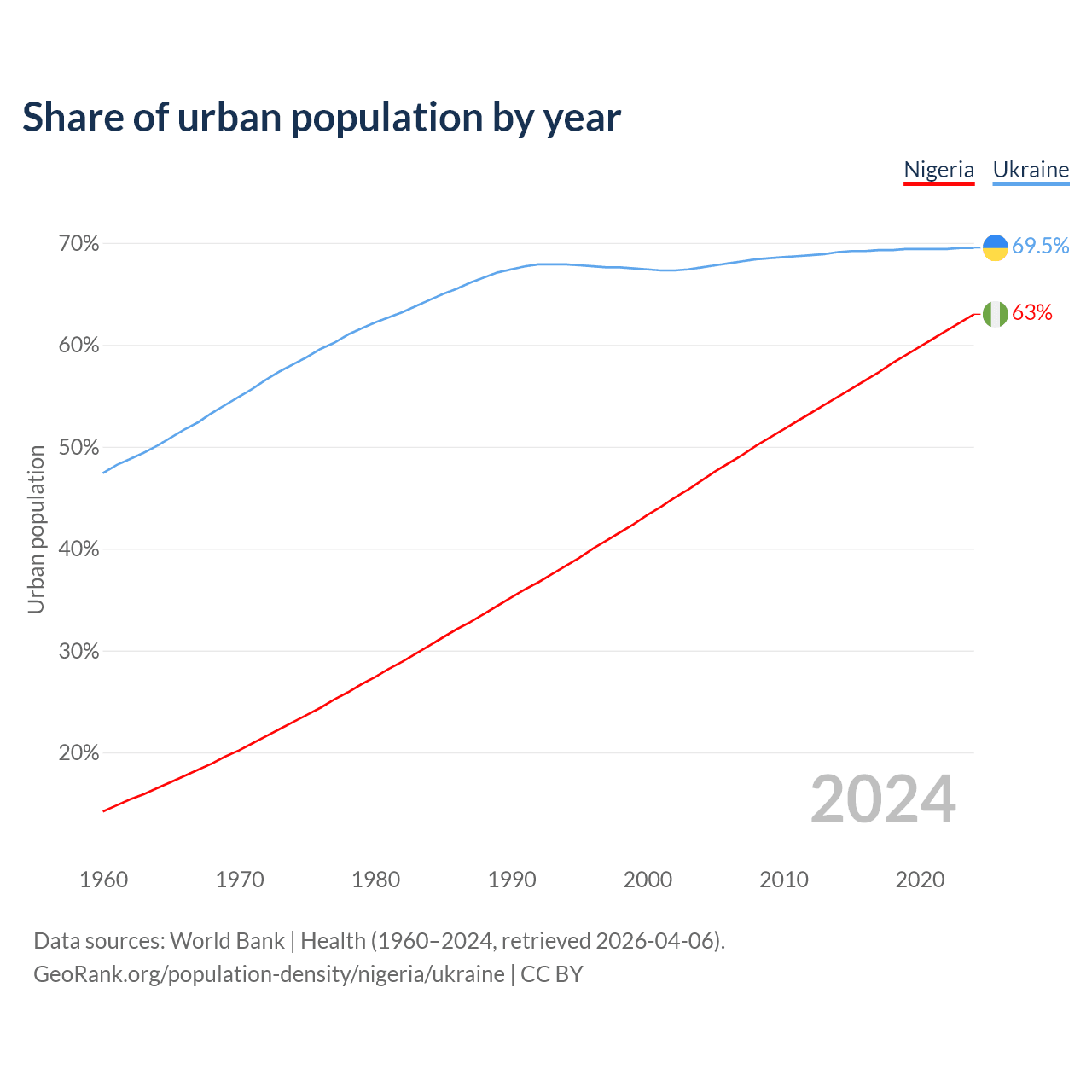 From 2004 to 2024, the share of urban population changed from 46.7% to 63% in Nigeria and from 67.6% to 69.5% in Ukraine.