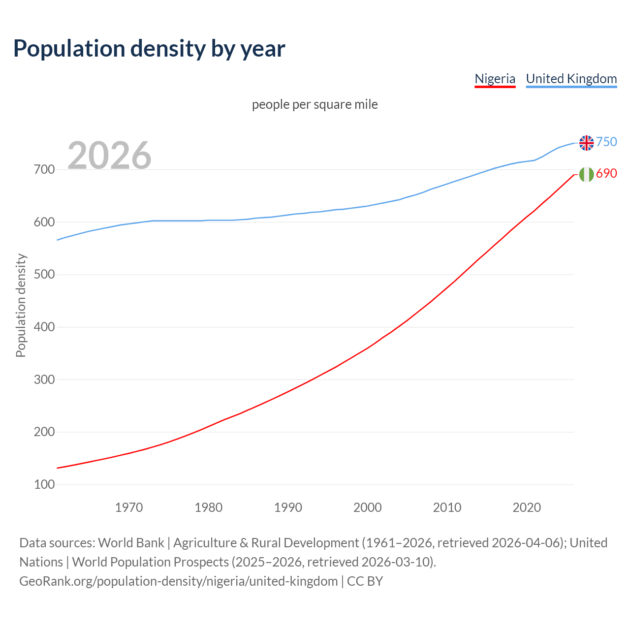 From 2006 to 2026, population density in Nigeria increased by 62.7%, compared to a 15.1% growth in the United Kingdom.