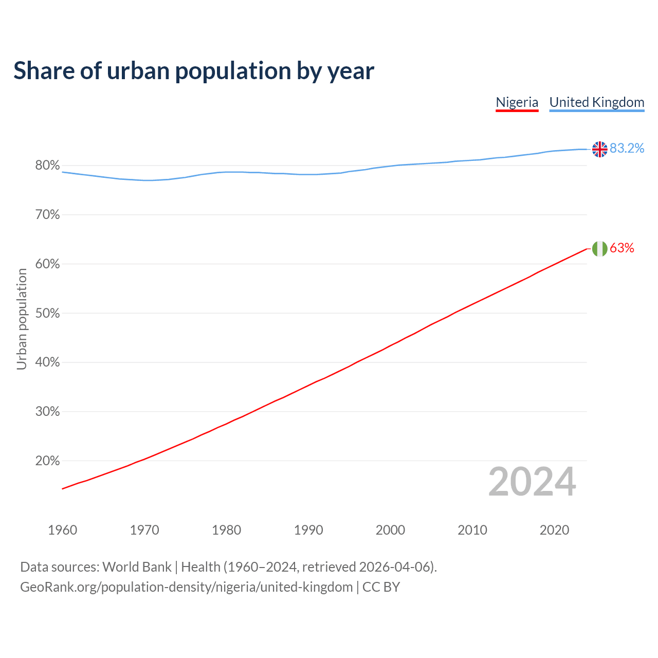 From 2004 to 2024, the share of urban population changed from 46.7% to 63% in Nigeria and from 80.3% to 83.2% in the United Kingdom.