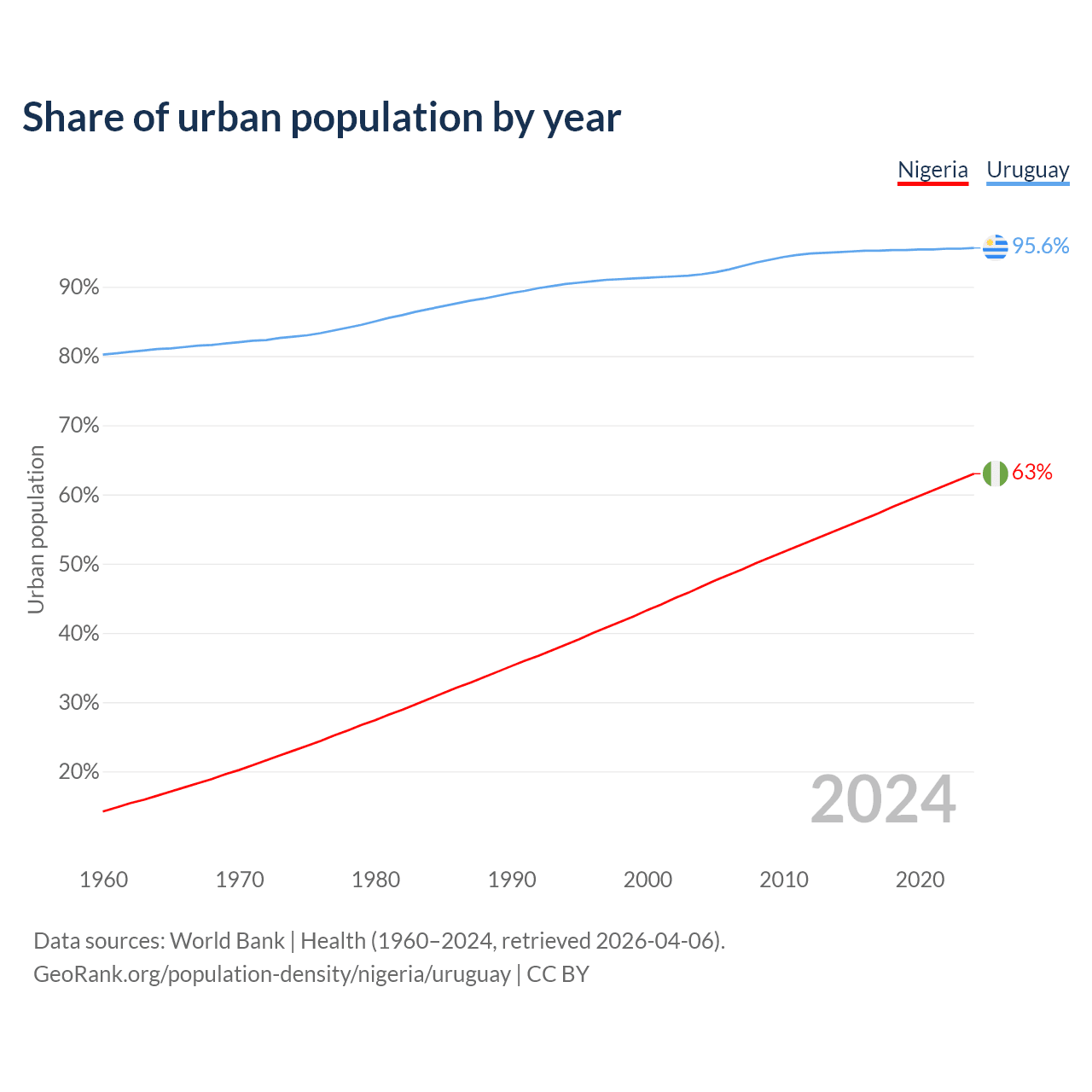 From 2004 to 2024, the share of urban population changed from 46.7% to 63% in Nigeria and from 91.8% to 95.6% in Uruguay.