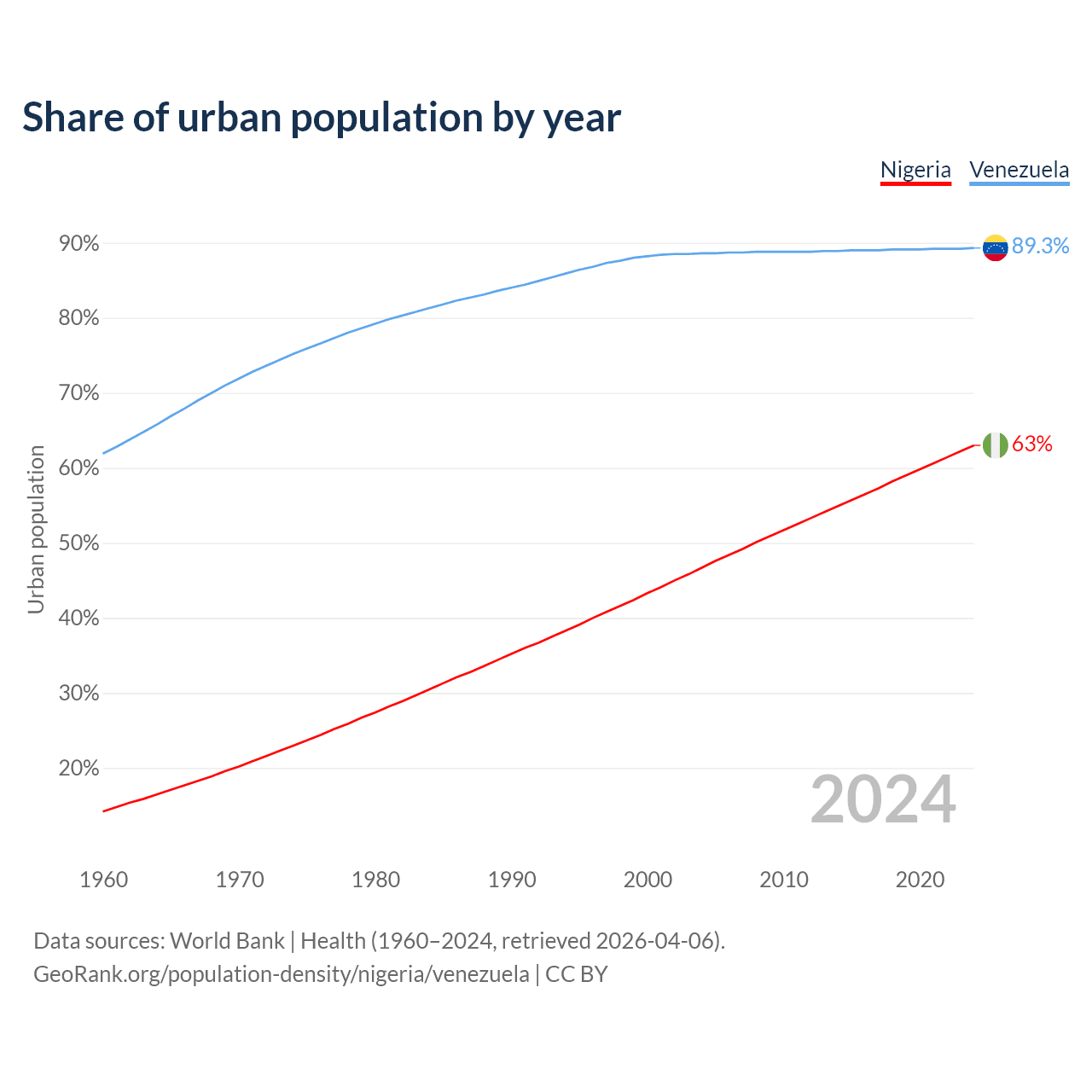 From 2004 to 2024, the share of urban population changed from 46.7% to 63% in Nigeria and from 88.6% to 89.3% in Venezuela.