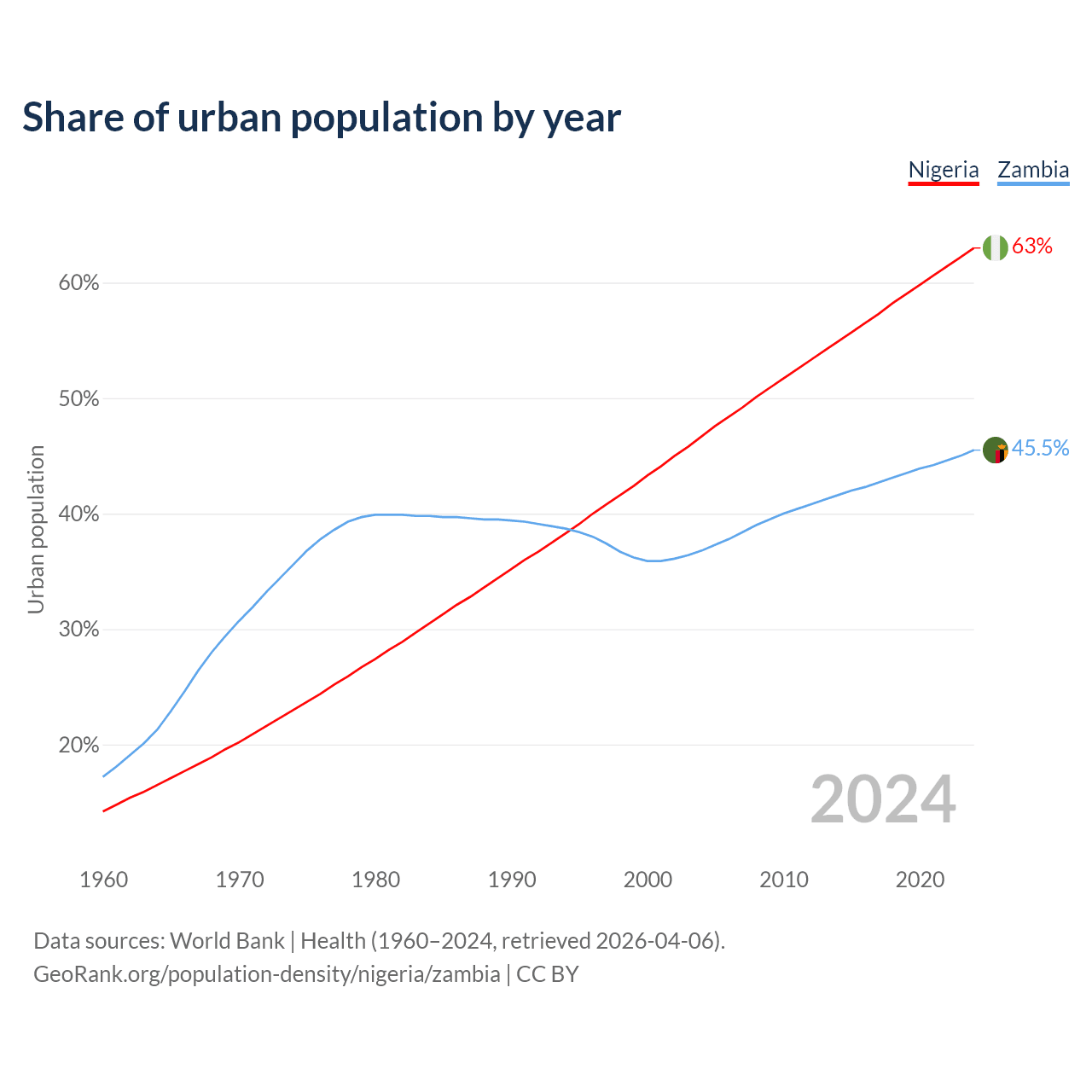From 2004 to 2024, the share of urban population changed from 46.7% to 63% in Nigeria and from 36.8% to 45.5% in Zambia.