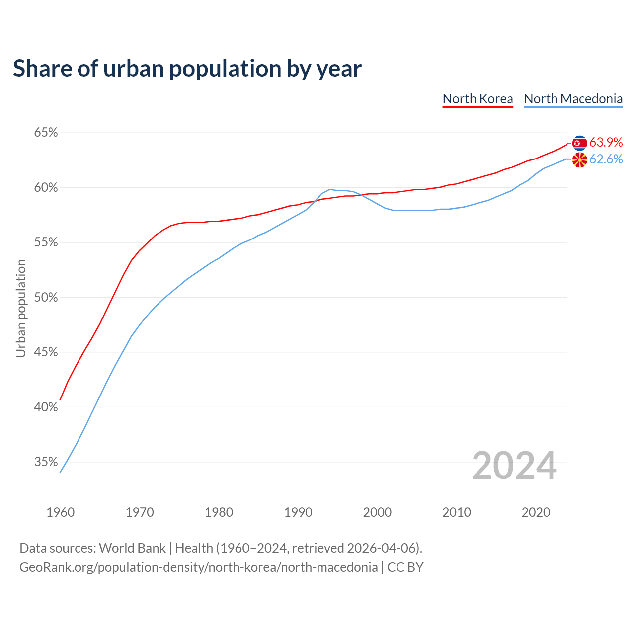 From 2004 to 2024, the share of urban population changed from 59.7% to 63.9% in North Korea and from 57.9% to 62.6% in North Macedonia.