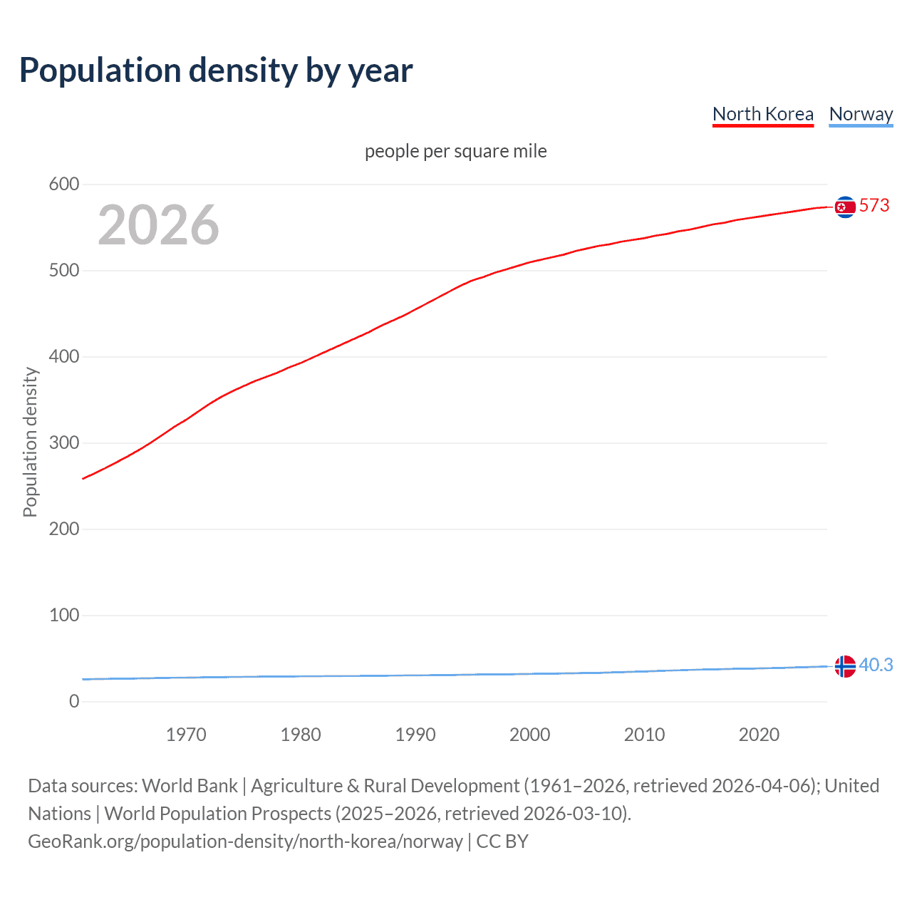 From 2006 to 2026, population density in North Korea increased by 8.64%, compared to a 21.9% growth in Norway.