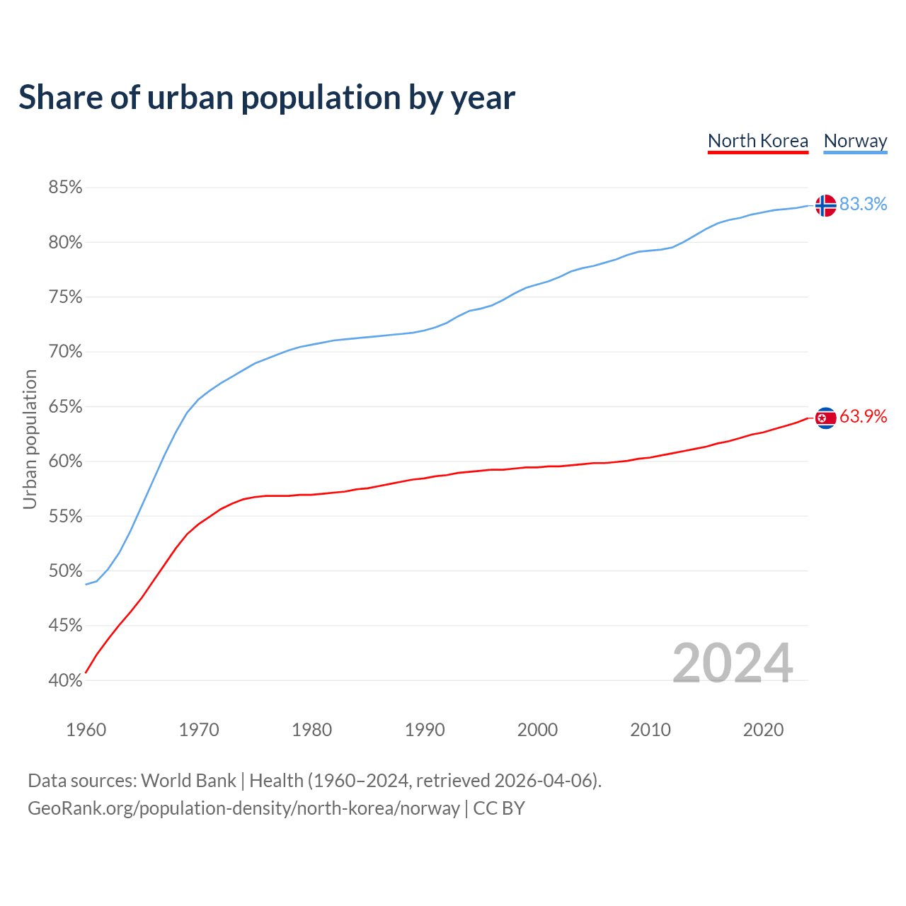 From 2004 to 2024, the share of urban population changed from 59.7% to 63.9% in North Korea and from 77.6% to 83.3% in Norway.