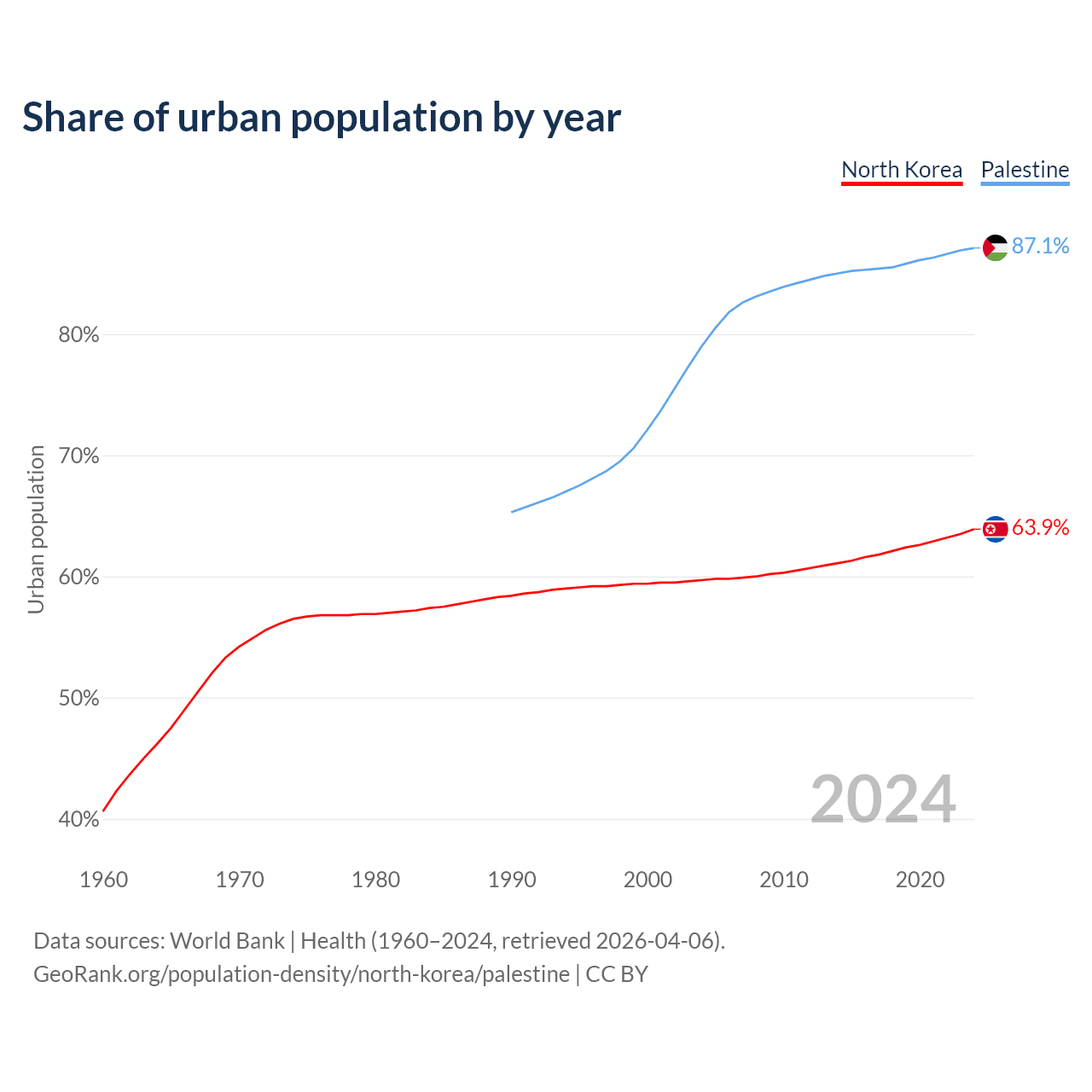 From 2004 to 2024, the share of urban population changed from 59.7% to 63.9% in North Korea and from 79% to 87.1% in Palestine.