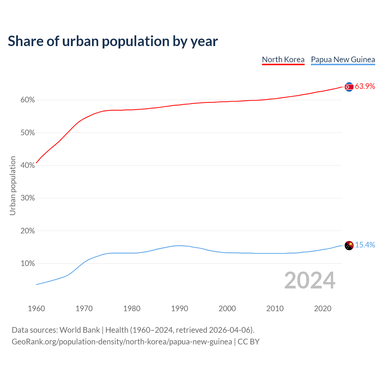From 2004 to 2024, the share of urban population changed from 59.7% to 63.9% in North Korea and from 13.1% to 15.4% in Papua New Guinea.
