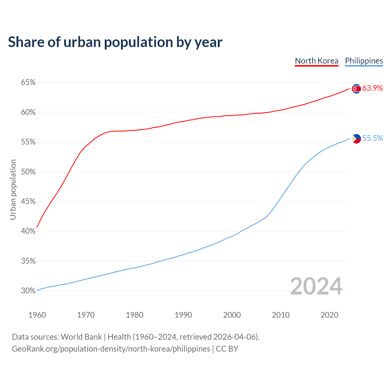 From 2004 to 2024, the share of urban population changed from 59.7% to 63.9% in North Korea and from 40.9% to 55.5% in the Philippines.