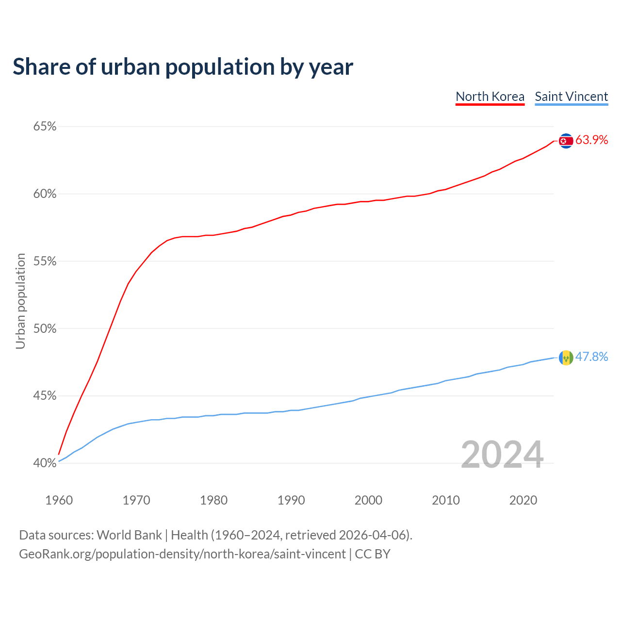 From 2004 to 2024, the share of urban population changed from 59.7% to 63.9% in North Korea and from 45.4% to 47.8% in Saint Vincent.