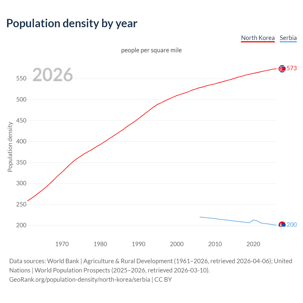 From 2006 to 2026, population density in North Korea increased by 8.64%, compared to a 8.86% decline in Serbia.
