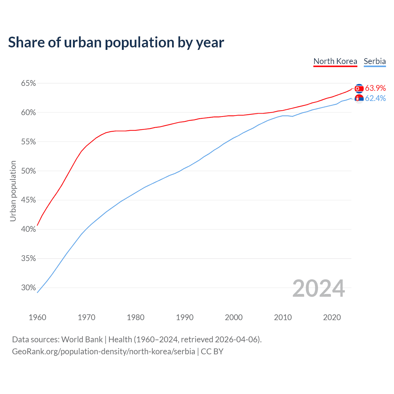From 2004 to 2024, the share of urban population changed from 59.7% to 63.9% in North Korea and from 57.3% to 62.4% in Serbia.